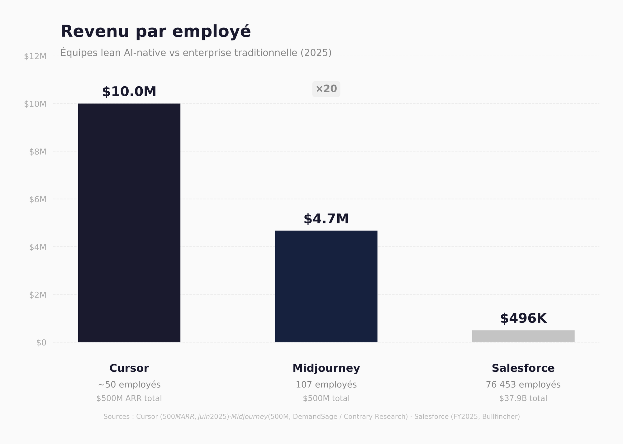Cursor atteint $500M d'ARR avec moins de 50 employés. Gumloop lève $17M avec deux personnes à temps plein. Lovable devient licorne en huit mois avec 45 salariés.