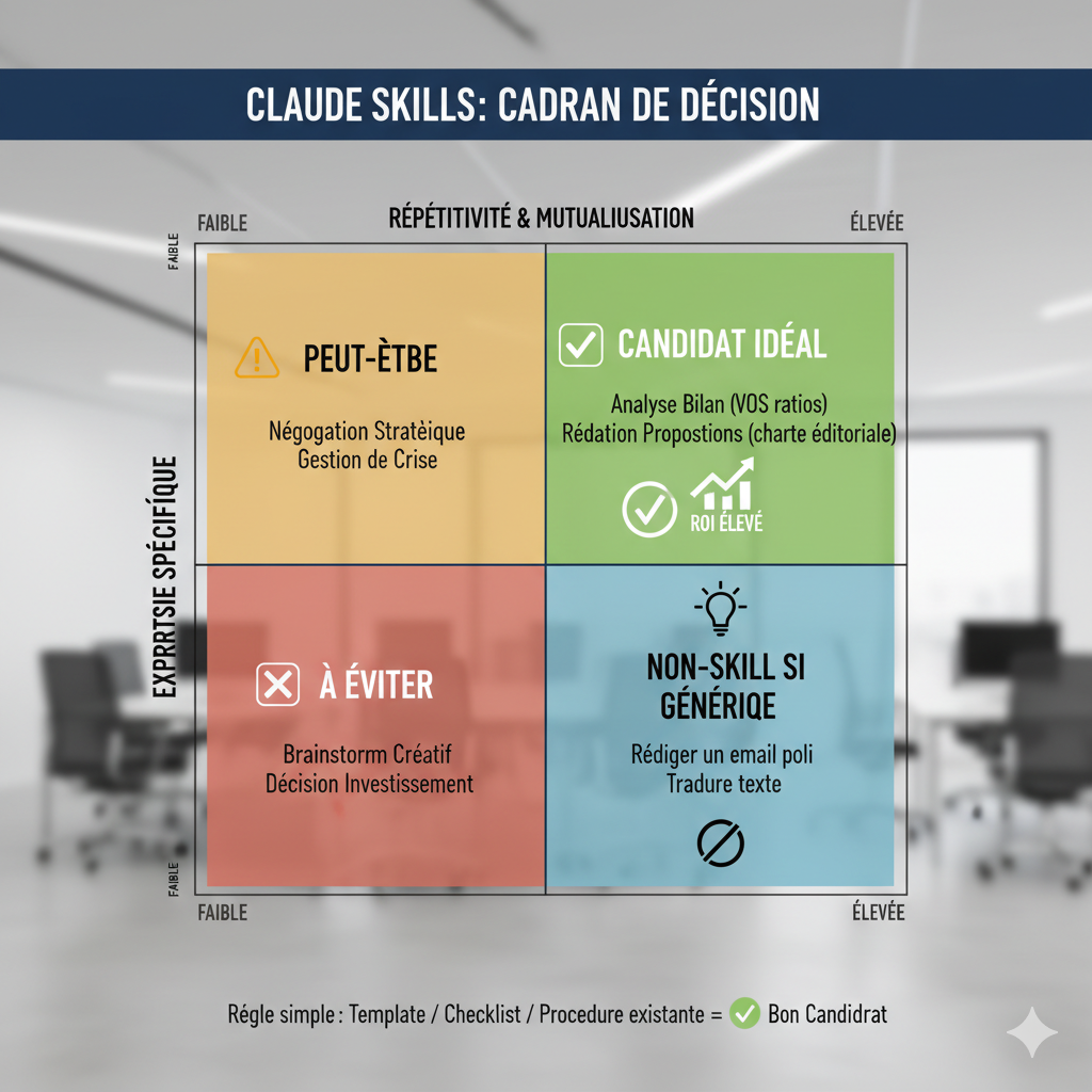 Règle simple : Si vous avez déjà un template, une check-list, ou une procédure pour cette tâche → c'est un bon candidat pour un Skill.