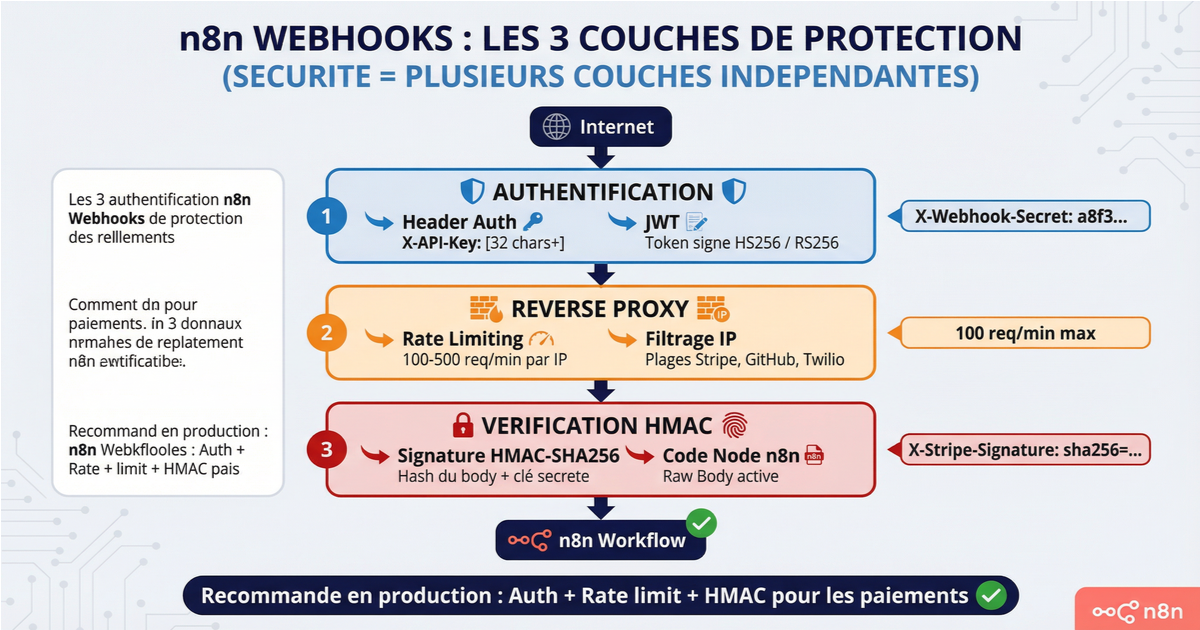 En résumé — en production, un webhook devrait toujours être protégé par au moins deux couches : authentification (header ou JWT), rate limiting côté reverse proxy, et vérification HMAC pour les événements critiques (paiements, créations de comptes).
