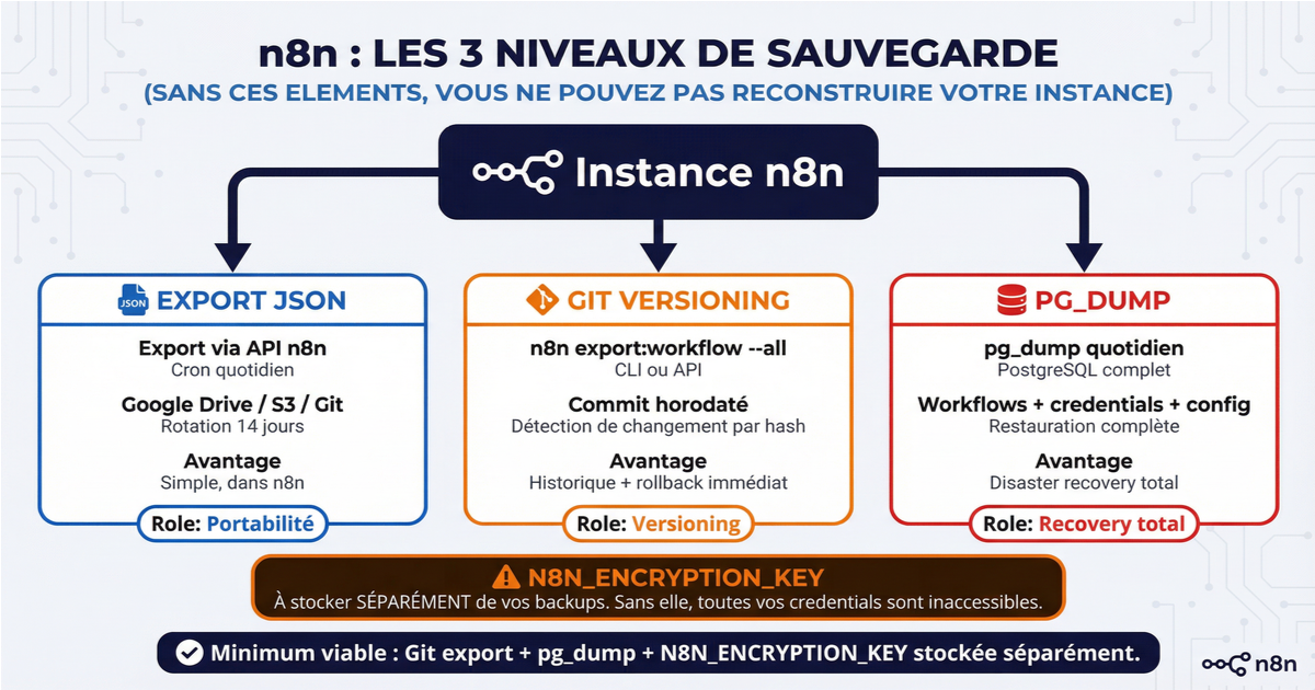 Minimum viable backup pour n8n — export des workflows vers Git (quotidien), sauvegardepg_dumpde la base PostgreSQL, et laN8N_ENCRYPTION_KEYstockée séparément dans un endroit sécurisé. Sans ces trois éléments, vous ne pouvez pas reconstruire votre instance.