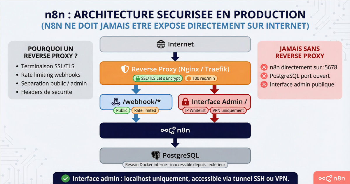 N'exposez jamais n8n directement sur internet. Jamais. L'interface d'administration, l'éditeur de workflows, et les endpoints webhook ne doivent pas être accessibles sans une couche intermédiaire.