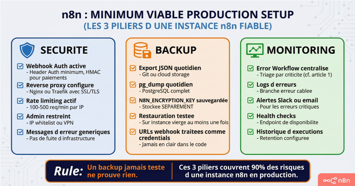 Chaque webhook a une authentification activée (header auth au minimum, HMAC pour les paiements). n8n tourne derrière un reverse proxy avec SSL/TLS. L'interface admin est restreinte par IP ou VPN. La base de données est PostgreSQL, accessible uniquement depuis le réseau Docker interne. La N8N_ENCRYPTION_KEY est générée, stockée séparément, et documentée. Un backup automatique quotidien est en place (Git ou cloud storage) et un pg_dump séparé pour la base. La restauration a été testée au moins une fois sur une instance vierge. Le rate limiting est configuré au niveau du reverse proxy. Un Error Workflow centralisé est en place pour les alertes (cf. article précédent de la série).